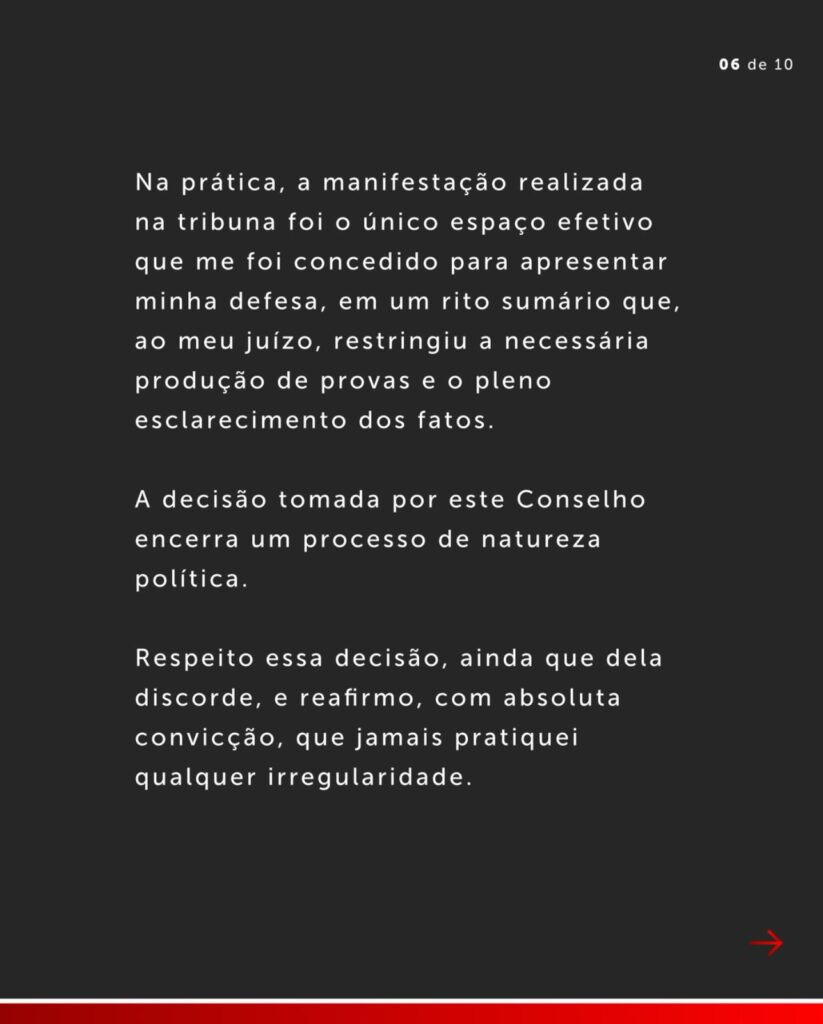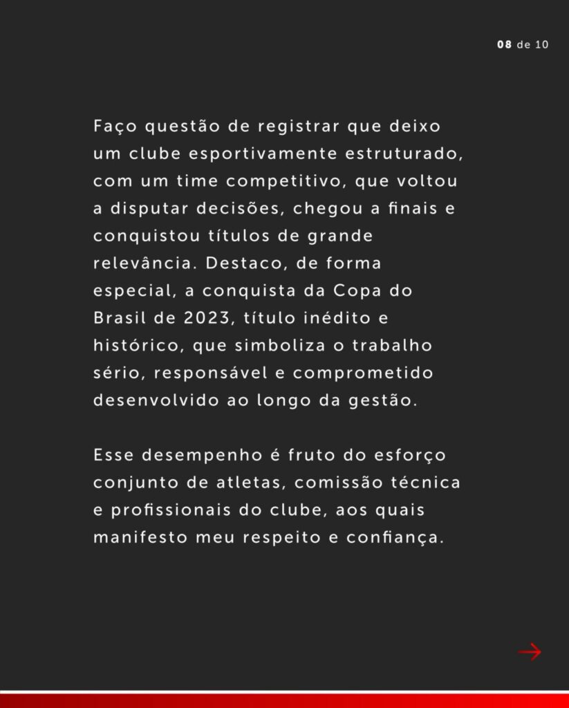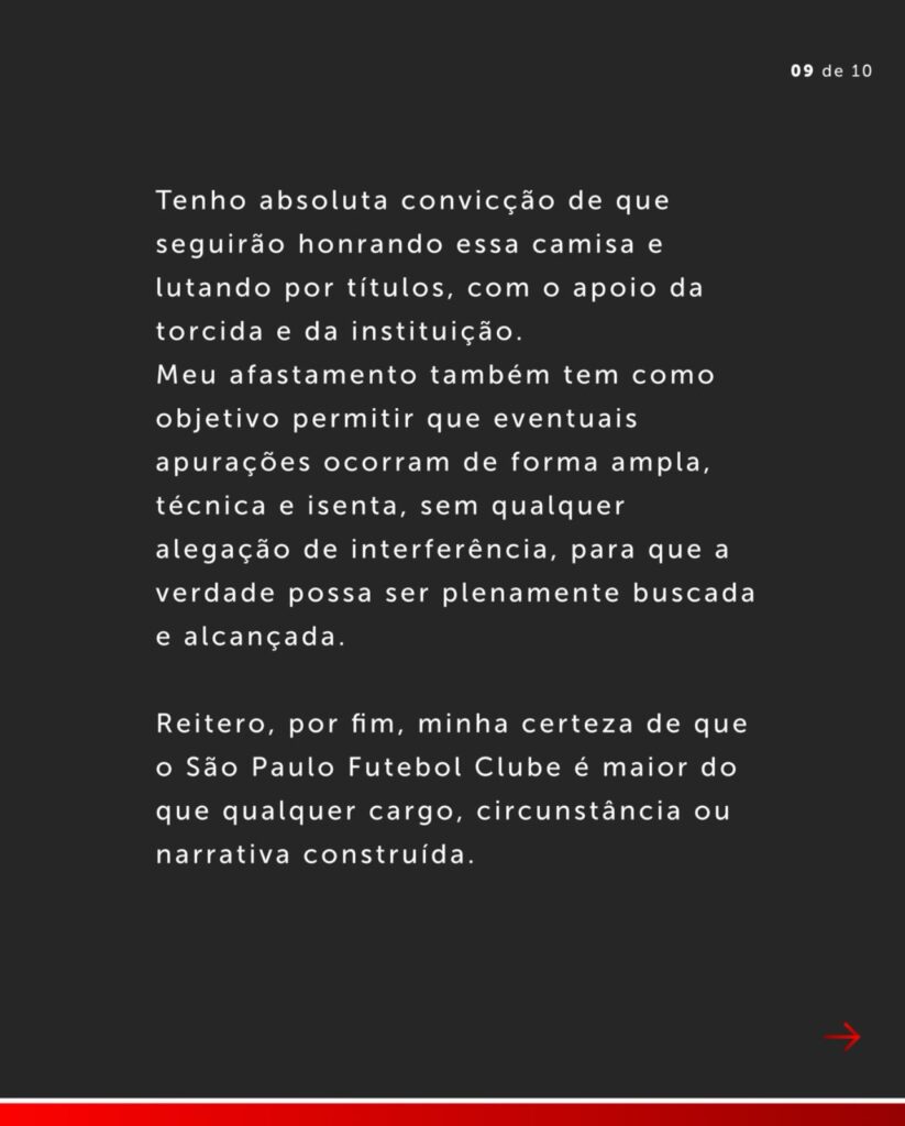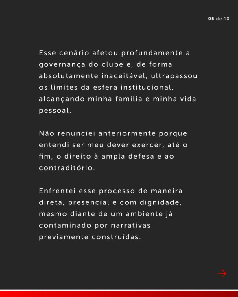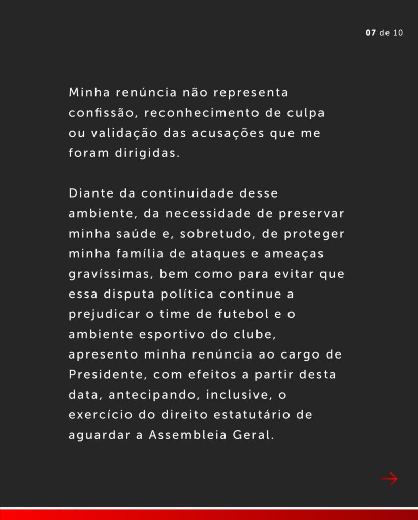 Em carta pública divulgada à torcida por meio de sus redes sociais, o ex-mandatário diz que a decisão não se trata de “uma confissão de culpa”, mas sim uma forma de preservar “a sua saúde e a de seus familiares”.