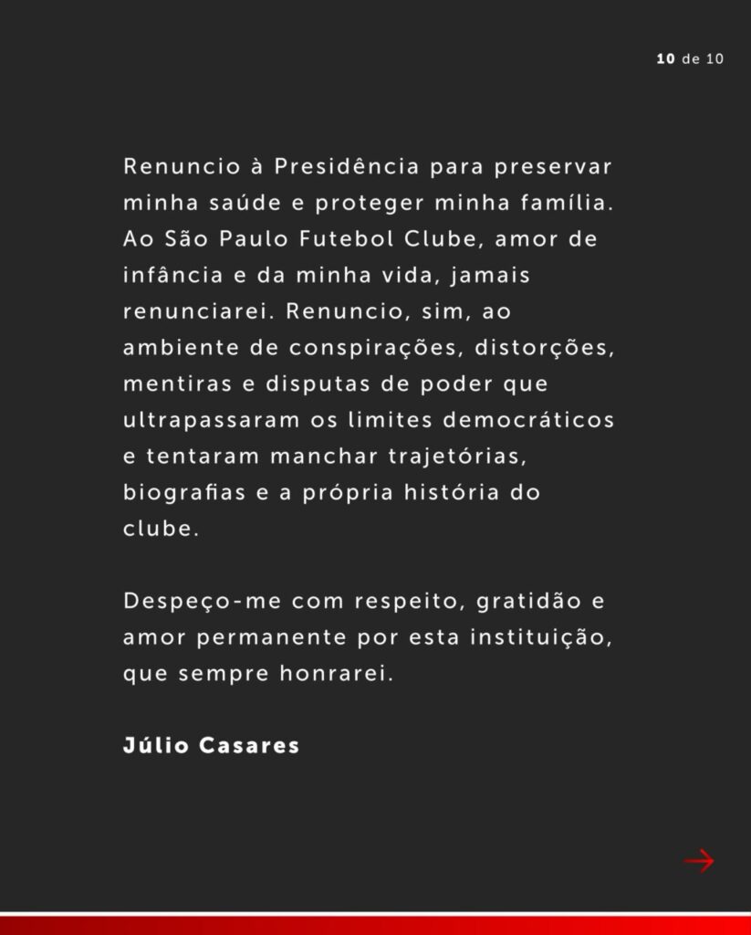 Agora acabou de vez: Julio Casares anunciou na tarde desta quarta-feira (21) a sua renúncia definitiva da presidência do São Paulo.