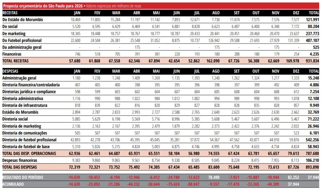 Além das despesas operacionais, o São Paulo estima ainda R$ 106,2 milhões em despesas financeiras, relacionadas a juros, encargos e compromissos da dívida.