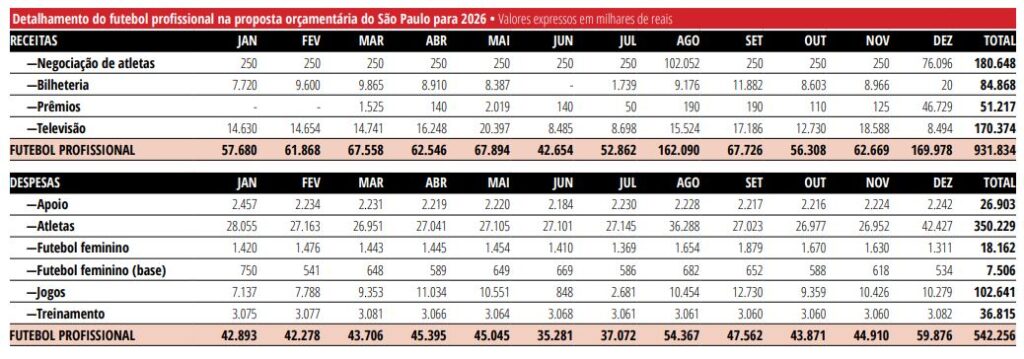 A proposta orçamentária do São Paulo para 2026 revela que por mais um ano a gestão Julio Casares aposta na venda de jogadores da base ou profissional e receitas com o estádio do Morumbi, sejam de bilheterias ou shows, como pilares para terminar com o lucro.