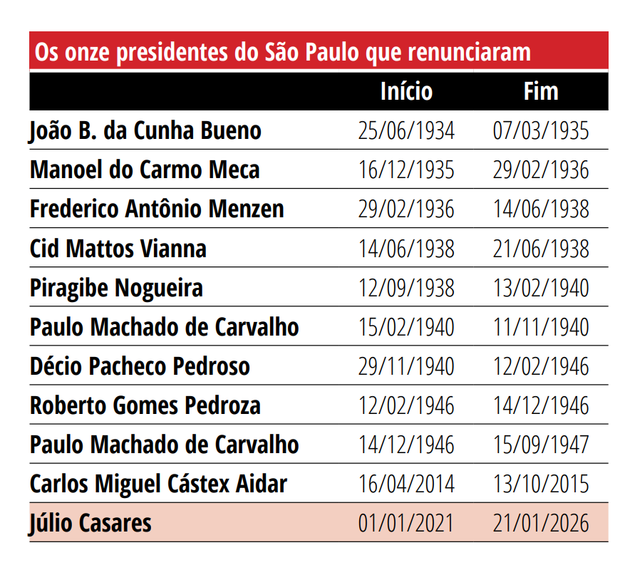 Em um recorte histórico mais distante, nos primórdios da fundação são-paulina, entre 1935 e 1947, oito mandatários renunciaram, sendo que um deles o fez em duas ocasiões.
