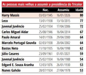 Massis só não é o presidente mais velho da história do clube porque Leco deixou o posto às vésperas de completar 83 anos, mas, caso decida disputar a reeleição e vença, encerrará um eventual segundo mandato no Tricolor com 84 anos. Veja a lista abaixo: