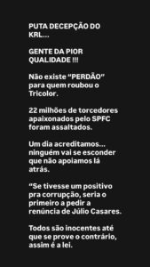 Diante desse cenário, a Dragões da Real solicita a renúncia do presidente Júlio Casares. Não como punição antecipada, mas como medida necessária para preservar o clube e permitir que as investigações ocorram sem pressões, interferências ou constrangimentos, garantindo o interesse maior do São Paulo Futebol Clube”, diz trecho da manifestação. Leia tudo no final desta matéria.