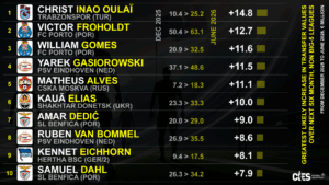 Já o meia Matheus Alves aparece em 5º lugar na projeção de valorização. Hoje o Made in Cotia possui valor estimado de 7,2 milhões de euros, com projeção de alcançar 18,3 milhões de euros nos próximos seis meses, como indicou o CIES, instituição reconhecida por análises estatísticas e projeções de mercado no esporte.