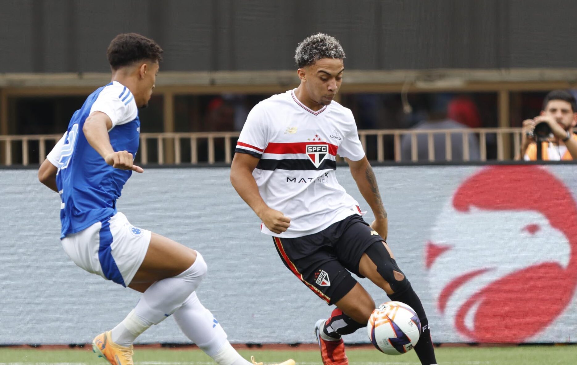 O Tricolor seguiu sofrendo durante a primeira etapa com o forte ritmo adversário, mas melhorou a concentração defensiva e afastou as principais jogadas perigosas do Cruzeiro. Aos 44’, Rayan escapou na cara do gol são-paulino, mas o goleiro João Pedro fez linda defesa com os pés.