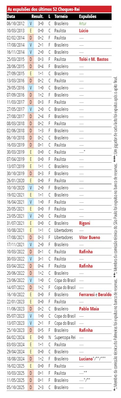 Com o lance, o Palmeiras manteve uma escrita que já dura mais de uma década: nenhum jogador expulso durante o tempo regulamentar de um Choque-Rei desde 2012. A última vez foi há exatamente 13 anos: Artur, na derrota alviverde por 3 a 0, pelo segundo turno do Campeonato Brasileiro, também num 6 de outubro, no Morumbi. Desde então, foram 12 expulsões durante os 51 clássicos entre os dois rivais, e todas elas de jogadores vestindo a camisa tricolor.