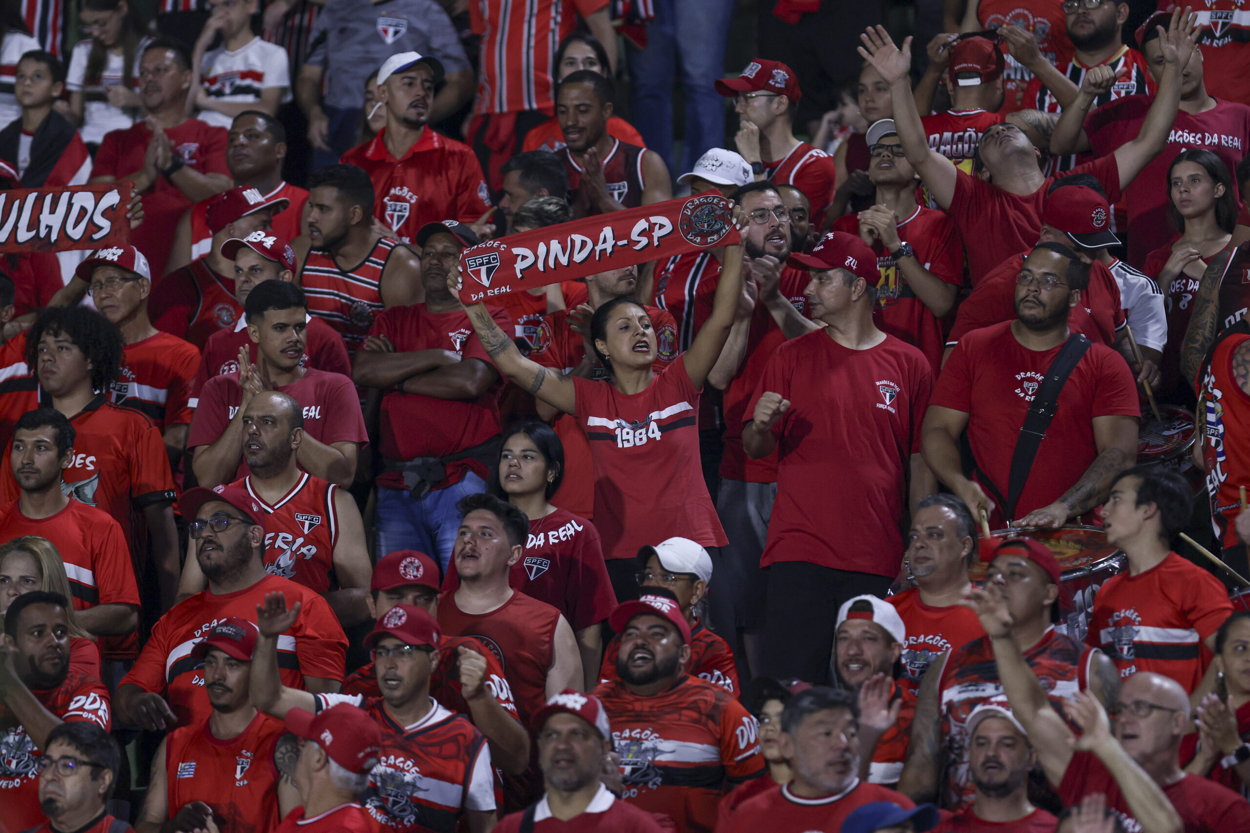 CAMPINAS, BRAZIL - APRIL 25: Fans of Sao Paulo cheer their team during the Brasileirao 2026 match between Sao Paulo and Mirassol at Estadio Brinco de Ouro on April 25, 2026 in Campinas, Brazil. (Photo by Ricardo Moreira/Getty Images)