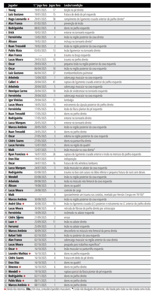 Tudo leva a crer que, caso o departamento médico não recupere ninguém a tempo, esse recorde seja batido no clássico contra o Corinthians, no próximo dia 20 (quinta-feira), em Itaquera.