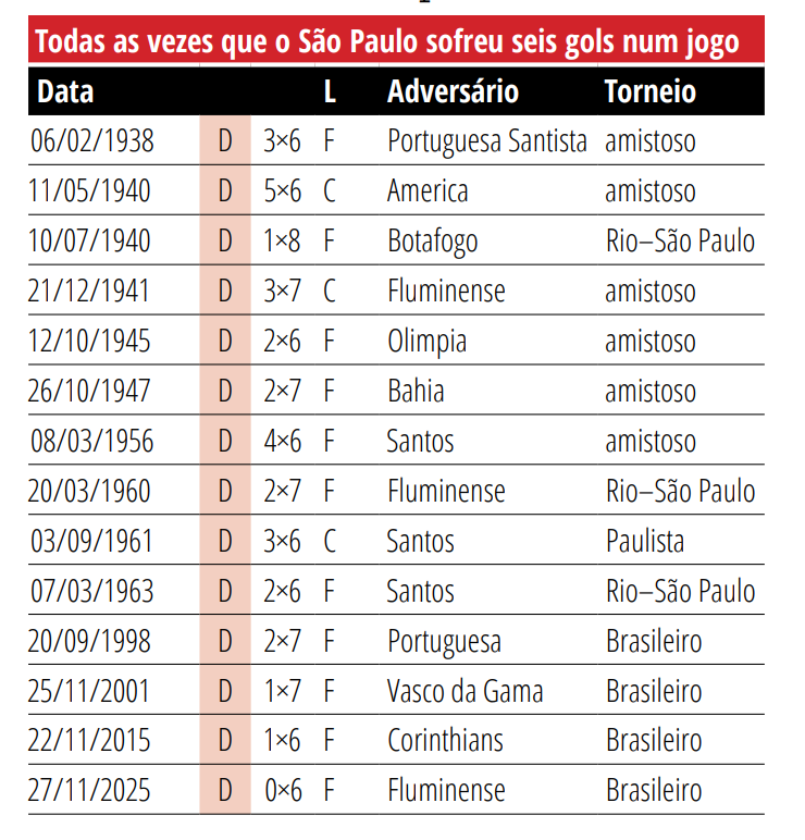 Até o vexame protagonizado na última quinta-feira (27), o São Paulo só tinha sofrido seis gols em outras 13 ocasiões na história, sendo a última dez anos e cinco dias antes, em clássico contra o rival Corinthians em Itaquera, também pelo Campeonato Brasileiro.