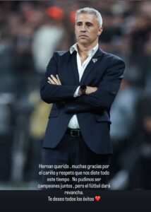 O chamando de ‘querido’, Calleri agradeceu pelo carinho e respeito neste tempo juntos, desejando sucesso ao treinador. Já o ‘anárquico’ Luciano, como Crespo o gostava de chamar, se manifestou também em agradecimento pelos ensinamentos, mandando suas energias positivas ao agora ex-técnico. Mais tarde, os defensores Alan Franco e Maik também se solidarizaram via redes sociais.
