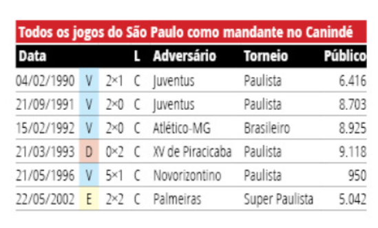 Ao todo, foram apenas seis partidas, incluindo essa, do Tricolor como mandante no Canindé, todas elas a partir de 1990, com quatro vitórias, um empate e uma derrota. A média de público são-paulina no local é de 6.526 torcedores.