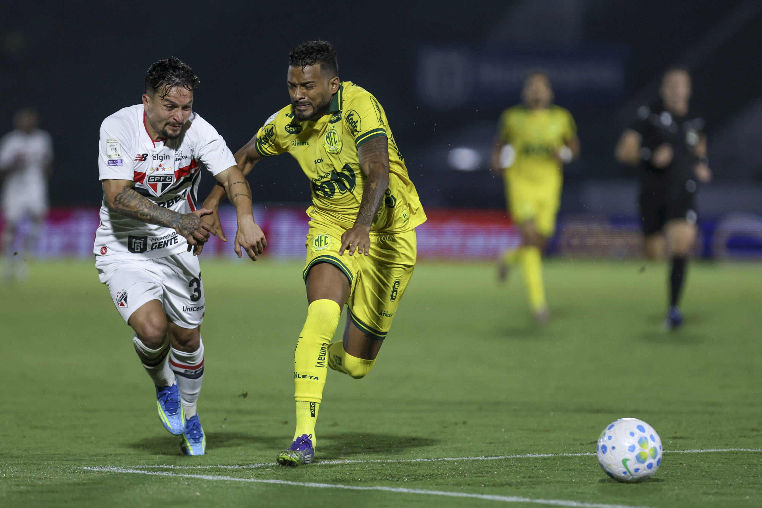 CAMPINAS, BRAZIL - APRIL 25: Artur of Sao Paulo competes for the ball with Reinaldo of Mirassol during the Brasileirao 2026 match between Sao Paulo and Mirassol at Estadio Brinco de Ouro on April 25, 2026 in Campinas, Brazil. (Photo by Ricardo Moreira/Getty Images)