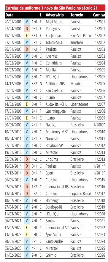 Pela quarta vez seguida, o São Paulo estreou um novo uniforme 1 com vitória, ao derrotar o Grêmio, no Morumbi, pelo Campeonato Brasileiro. A pesquisa é do Arquivo Histórico do São Paulo.