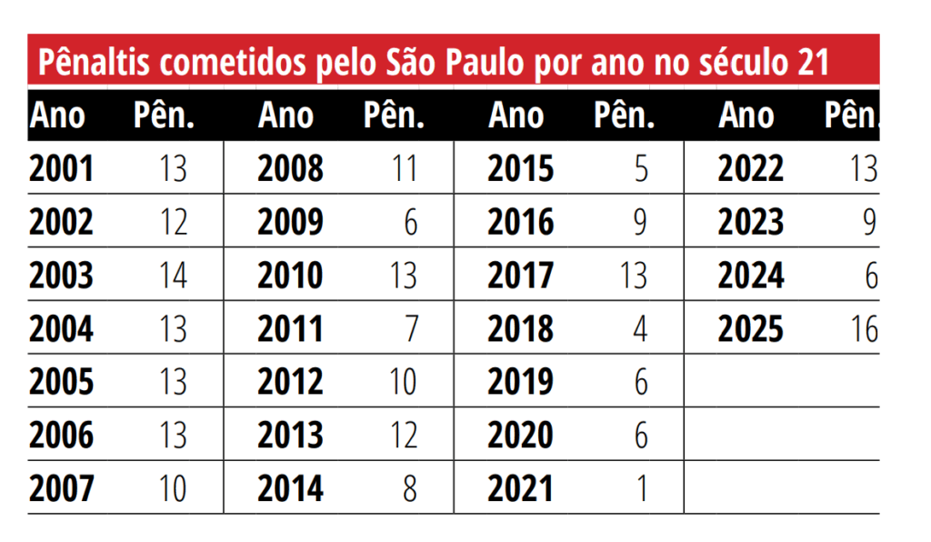 O problema, porém, é menos episódico e mais estrutural. Com 16 pênaltis cometidos em 2025, o São Paulo já registra seu maior número deste século em uma única temporada. A última vez que o volume foi tão alto foi justamente em 2000, com 22 infrações dentro de sua área, sendo 17 convertidas e cinco defendidas, com uma destas se transformando em gol no rebote.
