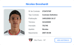 Um dos grandes talentos da nova geração de Cotia é o talentoso lateral esquerdo Nicolas Bosshardt, já promovido aos profissionais por Hernán Crespo neste ano. O jovem de apenas 18 anos teve seu contrato prorrogado pelo São Paulo nesta quarta-feira (14), com aumento bastante significativo de sua multa a clubes nacionais.