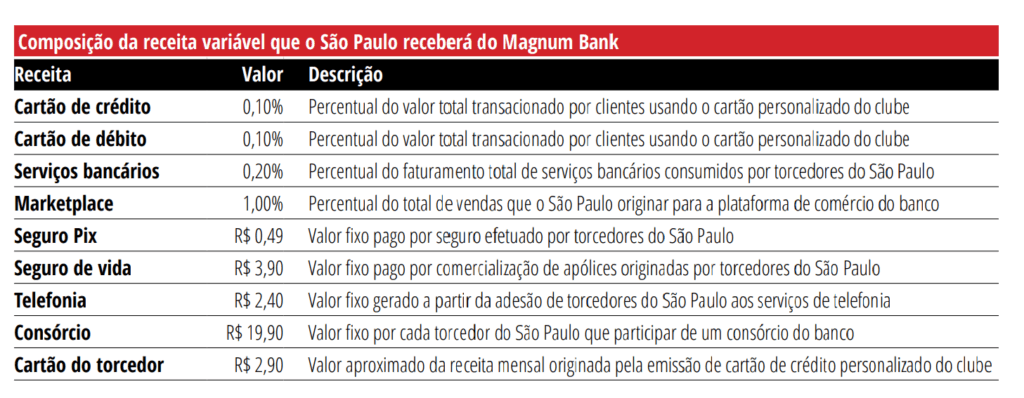 Em quase todos os casos, o Tricolor terá direito apenas ao que seus torcedores consumirem na plataforma do banco, incluindo transações de cartões de crédito e de débito personalizados do clube.