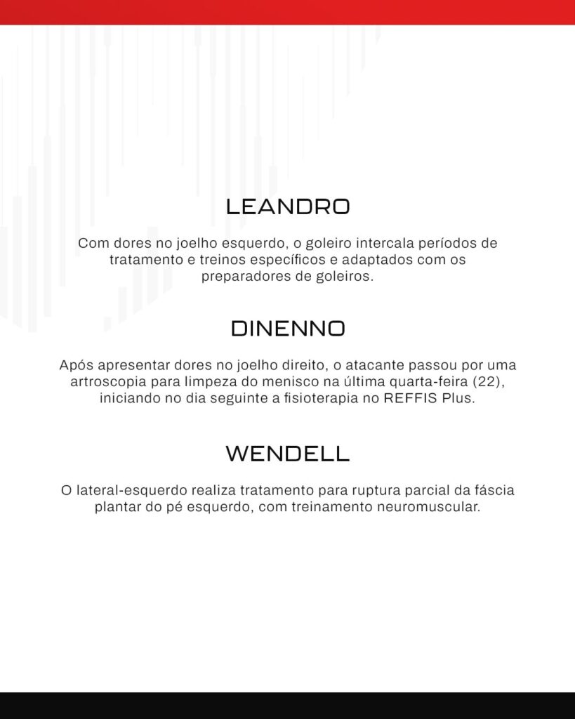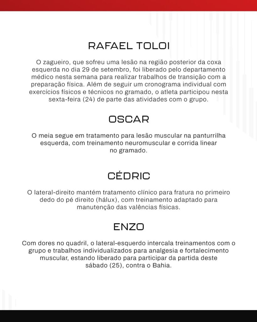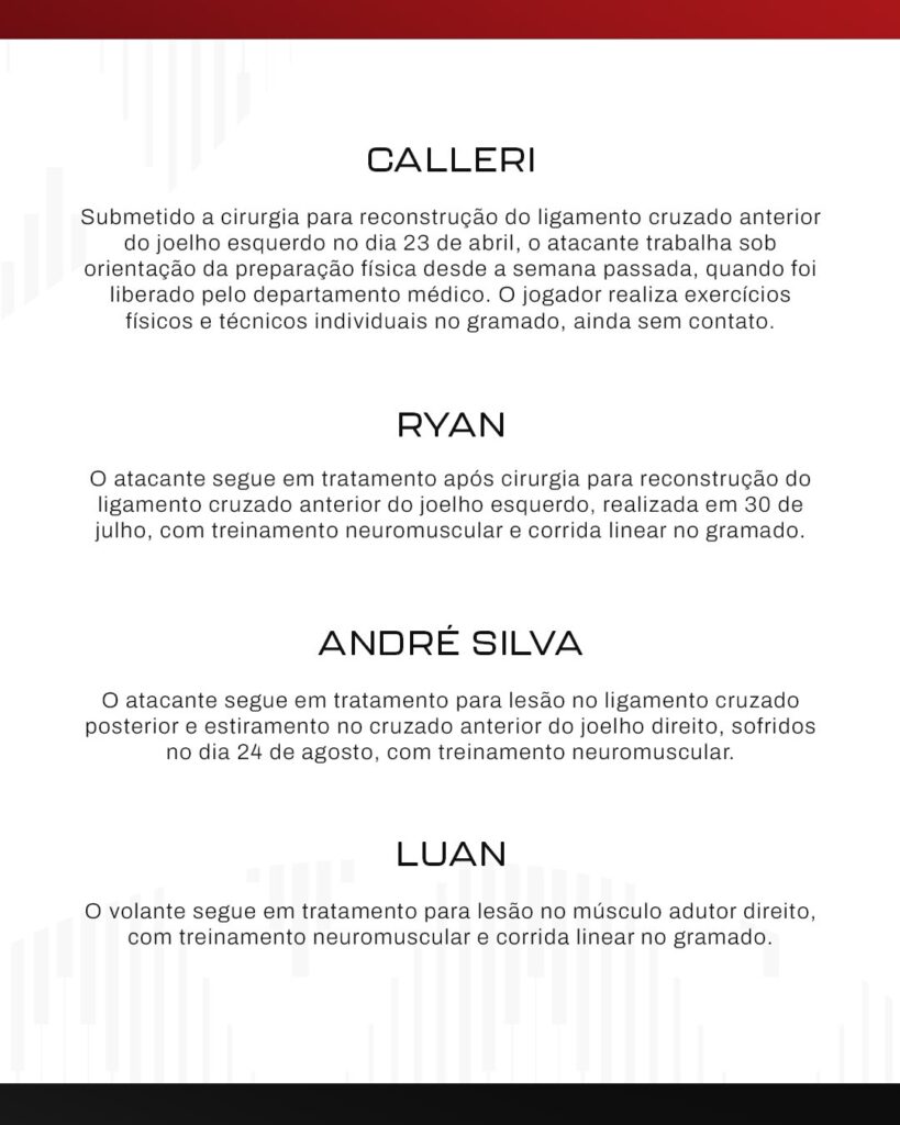 O atacante Calleri, que se recupera de cirurgia para reconstrução do ligamento cruzado anterior do joelho esquerdo e iniciou a transição ao lado de Tolói, continuou realizando exercícios físicos e técnicos individuais no gramado, ainda sem contato.