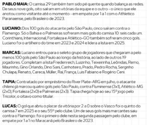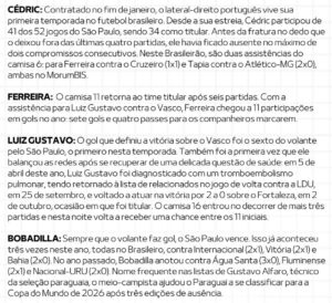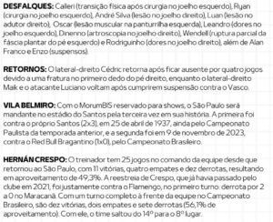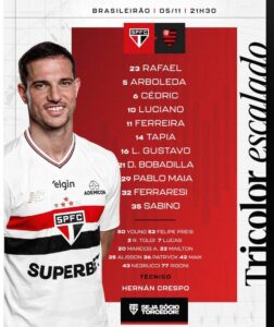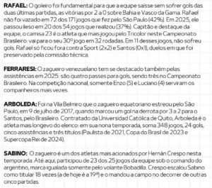 Os meias Lucas e Marcos Antônio foram poupados por Hernán Crespo para controle de carga. Existe risco de lesão. Podem jogar 45 minutos e devem entrar no segundo tempo. Confira as escalações, desfalques e destaques do Tricolor: