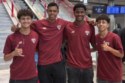 Quatro joias do São Paulo em Cotia viajaram para Stuttgart, na Alemanha, para um período de intercâmbio esportivo e cultural como parte da parceria firmada entre o Tricolor e o VfB Stuttgart. Nesta quarta-feira (8), o zagueiro Thiago, os volantes Kauã Edmar e Uelinton, além do meia-atacant...